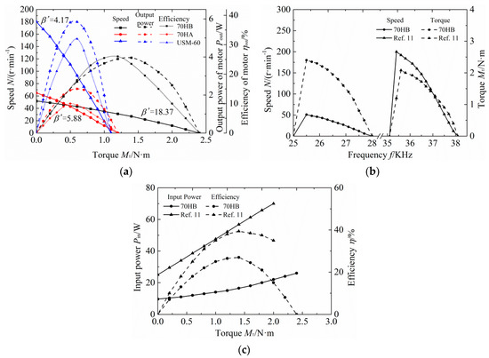 Performance curves of different motors: (a) mechanical characteristics of 70HA, 70HB, and USM-60; (b) mechanical characteristics of 70HB and the motor in Ref. [11]; and (c) power consumption of 70HB and the motor in Ref. [11].