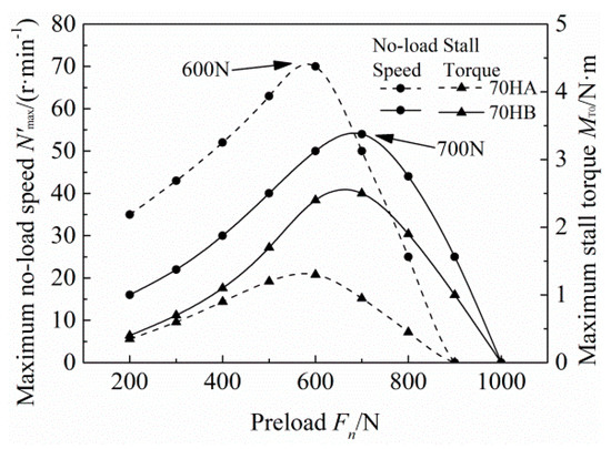 Because preload has a great influence on the output performance of the motor, it was necessary to analyze the influence of preload on the performance of the prototype. By adjusting the preload nut when assembling the motor, the mechanical output characteristics of the motor with different preload levels could be tested. The experiments showed that the no-load speed and stall torque of 70HA and 70HB were smaller when the preload was small (about 200 N). With increasing preload, the no-load speed and stall torque of both motors increased rapidly and tended to be flat. The no-load speed and stall torque of 70HA reached their peak at about 600 N, then decreased rapidly, and the motor failed to start at about 900 N. The no-load speed and stall torque of 70HB reached their peak at about 700 N, then decreased rapidly, and the motor failed to start at about 1000 N. The optimum preload of both motors was larger than the preset 550 N, and the optimum preload of 70HB was about 100 N larger than that of 70HA. The results also show that the 70HB stator has larger normal amplitude, which can make it withstand greater preload and significantly increases the stall torque, as shown in Figure 16.