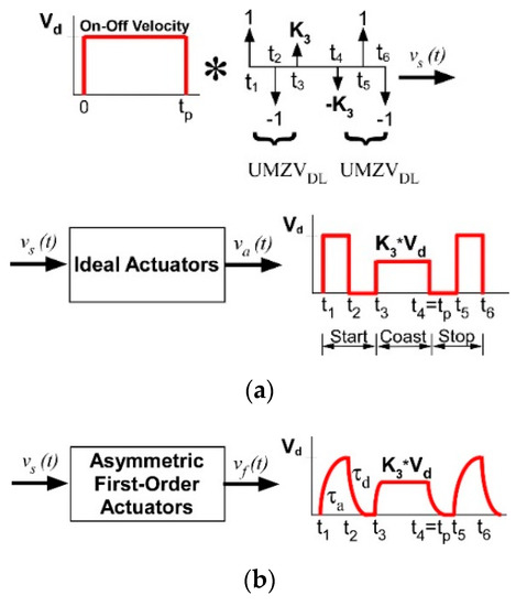 where , , and are the natural frequency of a mass–spring–mass system and the magnitude and time of the impulse, respectively; the final limited impulse magnitude is defined as ; and the deflection limit, , is defined as the ratio between the allowable and maximum deflections. The UMZVDL shaper is convolved with a pulse input such that the shaped commands are shown as on–off command profiles and lead to zero transient and residual oscillations for ideal flexible systems. However, if the shaped command is applied to a flexible system with asymmetric first-order actuators, the control performance is degraded because of the distorted command, as shown in Figure 1. Therefore, a deflection reduction shaped command is newly required to account for asymmetric first-order actuators.