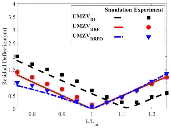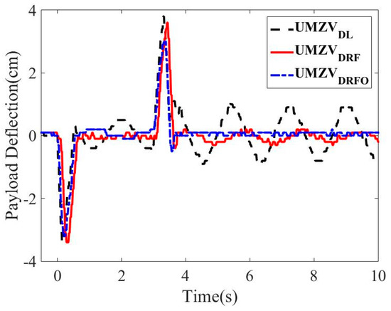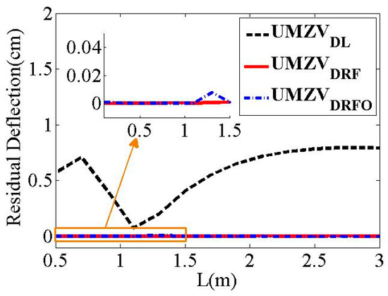 In addition, the residual maximum deflection is evaluated to illustrate the effect of the suspension cable length as shown in Figure 6. The UMZVDRF shaper and UMZVDRFO shaper are superior to the UMZVDL shaper except for at a cable length . This result means that the first-order actuator dynamics should be considered for better control performance in the application of the input shaping technique.