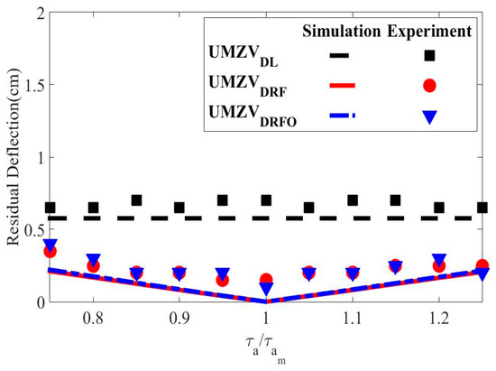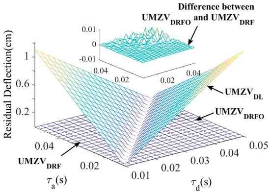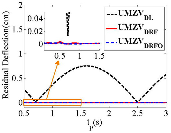 For the evaluation of residual oscillation as shown in Figure 8, the UMZVDL shapers produce only a low oscillation magnitude at . However, the UMZVDRF and UMZVDRFO shapers present much better residual deflection performance than that of the UMZVDL shaper within the entire evaluation range. In the difference plot, the UMZVDRFO shaper shows slightly better control performance than that of the UMZVDRF shaper owing to the approximation effect in the region of relatively large time constants.