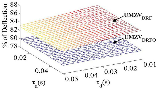 where a non-dimensional ratio is defined with respect to the largest magnitude influencing the deflection response. In the case of time constants for ideal actuators, Equation (9) is expressed as , implying a selection range , and resulting in the relation between the UMZVDRF and UMZVDRF shapers.