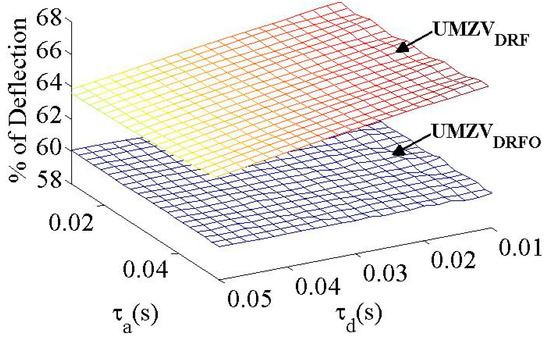 Figure 18 shows the robustness with respect to the time constant uncertainty of actuators. The UMZVDL shaper shows a consistent residual deflection performance that means no counteraction to the modeling error of the actuator. However, the UMZVDRF and UMZVDRFO shapers present an experimentally predictable deflection reduction performance unlike the UMZVDL shaper.