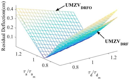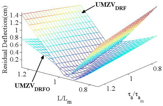 Figure 11 and Figure 12 show the residual deflection reduction performance on the modeling uncertainty of the UMZVDRF and UMZVDRFO shapers with regard to reference parameter values , , and .