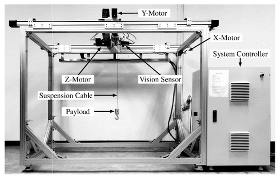 To experimentally evaluate the control performance of the proposed shapers, a mini-bridge crane as shown in Figure 13 was utilized. The schematic configuration in Figure 14 shows the essential Siemens® components of the mini-bridge crane. Its workspace is 1.3 m × 0.75 m in the horizontal directions and 1.4 m in the vertical direction. For the system operating program, the Simatic® modules of the CFC, SCL, and WinCC software are employed to upload and download the experimental data. A VS720-series intelligent vision sensor in conjunction with a vision program generated by the Spectation® software is used to measure the payload oscillation magnitude. Four limit sensors are used to detect the x and y- axis boundaries for overtravel prevention.