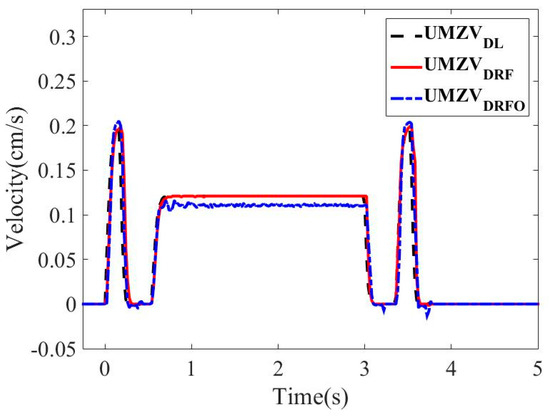 The control performances of the UMZVDL, UMZVDRF, and UMZVDRFO shapers are experimentally verified from the aspects of transient and residual deflections and the robustness to modeling uncertainties. For a specific case, all three input shapers are presented with the magnitude difference of the UMZVDRFO shaper from the others as shown in Table 2 even if the UMZVDL shaper is utilized for the initial condition during numerical optimization. In addition, Figure 15 shows the first-order velocity commands applied to the mini-bridge crane and resulting in the time responses shown in Figure 16, where the UMZVDRF and UMZVDRFO shapers present a control performance improvement of approximately 25% compared to that of the UMZVDL shaper.