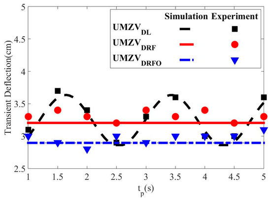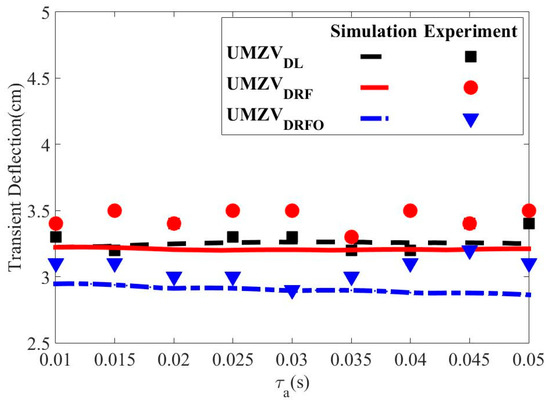 Lastly, the transient limiting performance is evaluated with respect to the time constant and switching-on time. Figure 19 and Figure 20 show the maximum deflection magnitude during the period of transient responses at . As shown in Figure 19, the UMZVDRFO shaper shows a slightly better maximum transient deflection magnitude than that of the others. From the aspect of the usability of input shapers, the UMZVDRF shaper presents a physical transient maximum deflection performance similar to that of the UMZVDRFO shaper. Figure 20 shows the transient maximum deflections with regard to switch-on time tp. The UMZVDRF shaper illustrates a comparable control performance of a less than 10% discrepancy comparing to that of the UMZVDRFO shaper. However, the UMZVDL shaper shows 20% error in the maximum transient deflection limit compared to that of the UMZVDRF.