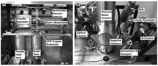 All of the electron beam melting (EBM) experiments were conducted using a customized Arcam A2 EB-PBF system (Arcam Build Control Software V3.2, SP2, Arcam AB, Sweden). While the EB-PBF operation and process parameters have been described in detail elsewhere [], it is important to highlight that in this work, the internal components of the commercial system have been removed and replaced with a custom 304 stainless steel build tank, platform, and powder feeder system. The customized chamber was designed with viewports that are oriented radially about the vertical axis of the electron beam column at a 55° angle to the surface of the experimental substrate/fixture, in order to view the entire build surface. The experiments were monitored with by an emissivity corrected single color pyrometer (Fluke Process Endurance Pyrometer, Fluke, Everett, WA, USA), a visible light camera (Nikon D7000, Nikon, Melville, NY, USA), a 200-amu residual gas analyzer (Stanford Research Systems, Sunnyvale, CA, USA), and an IR thermal imaging camera (FLIR A655sc, FLIR, Wilsonville, OR, USA). The viewport window materials varied as a function of the transmittance requirements for each instrument. Figure 2 shows a photograph of the customized setup.