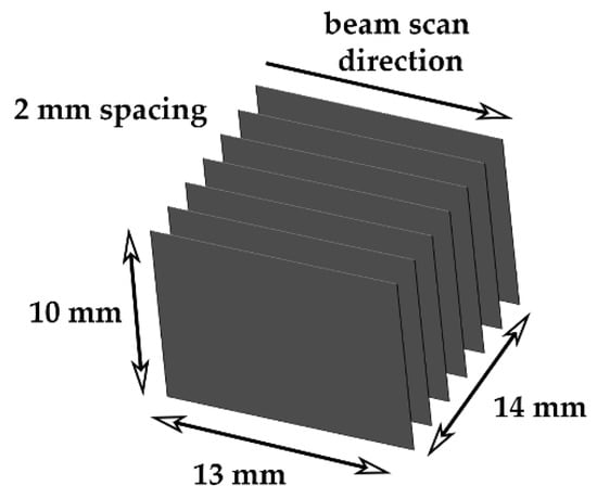 Based on the model results, single melt track width wafers 13 mm long and 10 mm tall were fabricated using hydrogen-treated HO-Cu powder with 2.0 mm on center spacings, as shown in Figure 3. The build substrate was a machined OFE copper substrate that measured 90 mm in diameter and 30 mm in thickness. During the EB-PBF processing, the build temperature was maintained at 270 °C, measured by a thermocouple attached to the bottom of the plate, and the partial pressures of H2O vapor and other gas species were monitored using the RGA. Each wafer was melted with a line energy of 0.8 J/mm (600 mm/s, 8 mA, 0 mA focus offset) and layer thickness of 40 µm, with the power analyze function (Arcam specific thermal controls) disabled. The beam scan direction was constant (right to left) for each wafer and each layer.