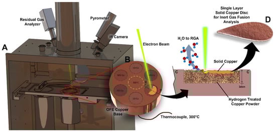 Illustration of the in-situ H2O vapor out-gassing experiment. The electron beam melting (EBM) vacuum chamber is outfitted with a residual gas analysis (RGA) and IR camera, and the surface temperature is monitored by a two-color pyrometer and thermocouple (A). The base fixture contains six 3 mm deep pockets (B), which are filled with hydrogen-treated and untreated powders with varying initial oxygen content. A single layer disc is melted on the top surface of each powder type. During melting, H2O is released from the powder or melt pool, and detected by the RGA (C). Upon completion, the powder is manually removed from the solid disc of copper, which is analyzed for oxygen and hydrogen content by inert gas fusion (D).