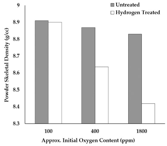 Plot showing the skeletal density of the untreated and hydrogen heat-treated copper powders of varying initial oxygen content, as measured by helium pycnometry.