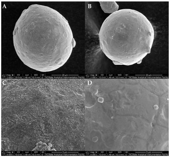 Because of its relatively high oxygen content, the MO-Cu powder was selected to observe the effect of hydrogen heat treatment on the surface oxides. Figure 7 shows the representative low and high magnification scanning electron micrographs of (Figure 7A,C) and the hydrogen-treated (Figure 7B,D) MO-Cu powder. Figure 7C shows the surface of the untreated MO-Cu powder, where bright spots were identified as oxygen-rich copper particles. Figure 7D shows the surface at the same magnification after the hydrogen treatment of the MO-Cu powder, where the surface oxides have been largely removed. These results were typical for untreated and hydrogen-treated MO-Cu and HO-Cu particles.
