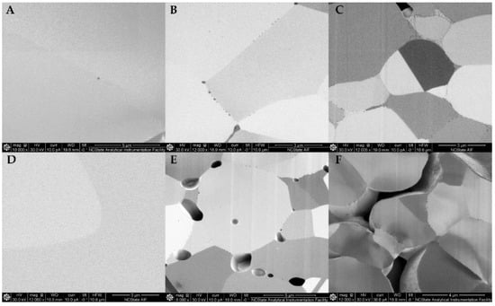 Representative high magnification ion channeling contrast micrographs of pretreated LO-Cu (A), MO-Cu (B), HO-Cu (C), and post hydrogen treatment LO-Cu (D), MO-Cu (E), and HO-Cu (F) focused ion beam (FIB) sectioned Cu powder particles showing the presence of grain boundary Cu2O in the untreated condition (A–C), which reacts with hydrogen to form H2O pores (E,F). LO-Cu powder lacks significant grain boundary oxides, and therefore does not exhibit H2O vapor induced porosity. Note that scale bars vary in the images.