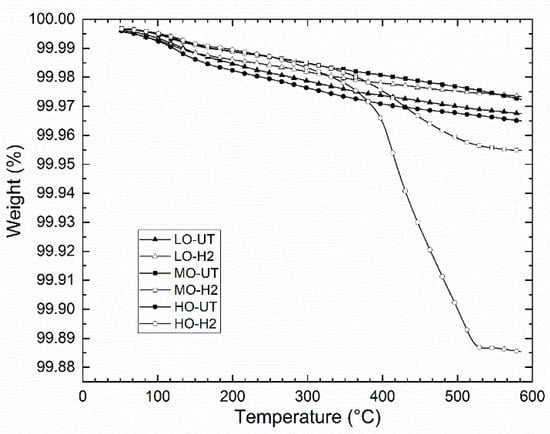 Figure 10 shows the results of the thermogravimetric analysis (TGA) of untreated and hydrogen-treated powders for the three initial oxygen contents. A TGA was carried out to ascertain the temperature at which the internal pressure of the H2O vapor pores exceeds the grain boundary strength of the copper powder particles. All of the untreated powders demonstrate no significant change in weight loss after heating to 600 °C at 5 °C/s. However, both hydrogen-treated MO-Cu and HO-Cu powders experience weight loss beginning at 375 °C, which then stabilizes at approximately 525 °C. Hydrogen-treated LO-Cu powder also shows minimal mass change while heating when compared to the hydrogen treated MO-Cu and HO-Cu particles. The weight loss can be correlated to the initial oxygen content of the powder before hydrogen treatment, indicating an increased presence of H2O in the hydrogen-treated particles at higher oxygen contents.