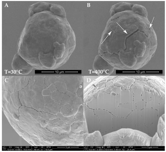 Figure 11C shows images of another particle surface at 400 °C immediately after the onset of the grain boundary fracture. In this case, the particle was quenched from this condition, and subsequently cross sectioned with a FIB, which reveals interconnected porosity along the grain boundaries inside the particle (Figure 11D). Here, the release of H2O vapor at 400 °C causes the interconnected porosity along the grain boundaries underneath the particle surface, with an additional porosity towards the center of the particle.