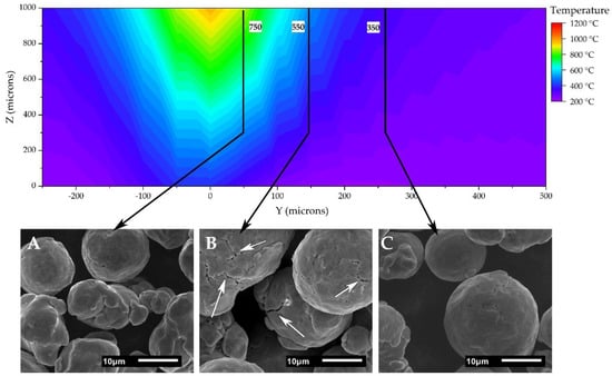 Contour plot of the temperature profile in the XZ plane during melting, with a 2000 µm hatch spacing, showing SEM images of particles located at the edge/wall (A), ~0.1 mm (B), and ~0.3–0.5 mm (C) from the wafer.