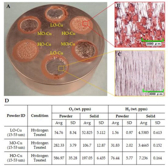 Photograph showing the oxygen free electronic (OFE) copper fixture after EB-PBF of single layer discs on top of hydrogen-treated powder cakes (A). Optical microscope images of the surface of single layer disc produced with hydrogen-treated HO-Cu showing pitting and porosity (B), and surface of single layer disc produced with hydrogen-treated LO-Cu, showing a smooth surface texture (C). Tabulated oxygen and hydrogen contents of the precursor powders and the solid single layer discs for each treated powder condition (D).