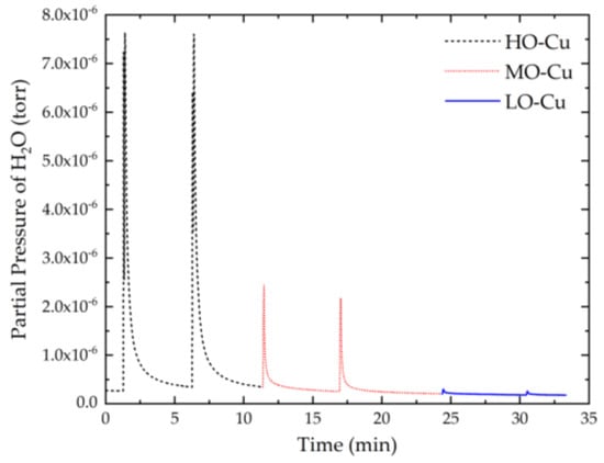 The residual gas analysis was measured as a function of time during the EB-PBF of HO-Cu, MO-Cu, and LO-Cu single layer discs, and is shown in Figure 14. Each disc was melted as a single step and the H2O partial pressure was allowed to stabilize before moving to the next step. The HO-Cu and MO-Cu powders show an increase in partial pressure of the H2O vapor during the melting of the disc with the intensity of the peak being indicative of the relative amount of hydrogen in the powder, as seen in Table 1. The peaks gradually diminish as the H2O vapor is removed from the system via the vacuum pumps. A minimal peak is witnessed during melting for the LO-Cu powder because of the absence of appreciable H2O vapor trapped in the particles.