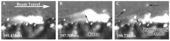 The presence of porosity on the surface of the discs produced from hydrogen-treated HO-Cu and MO-Cu powder is indicative of excessive spatter, and suggests that a portion of the H2O vapor escapes from the liquid copper, in addition to the cracking mechanism observed in both the EB-PBF wafer tests and the heated stage experiments. To examine this possibility, high speed imaging (30 kfps) was conducted during the melting process. Full videos are included as part of the Supplementary Materials in this report. Selected frames of high-speed footage of the EB-PBF of hydrogen-treated LO-Cu powder (Figure 15) show a relatively stable melt pool with minimal spatter. However, Figure 16 shows selected frames from the high-speed footage of hydrogen treated HO-Cu particles during melting, and in this case, significant spatter is observed, caused by the escape of H2O vapor and the expansion in the molten copper. Large bubbles, on the order of 1–2 mm in diameter, are observed expanding and collapsing from liquid copper several mm behind the EB spot. Figure 16B shows a bubble forming in the molten pool, which then collapses and ejects molten metal from the pool shown, in Figure 16C (indicated by arrows).