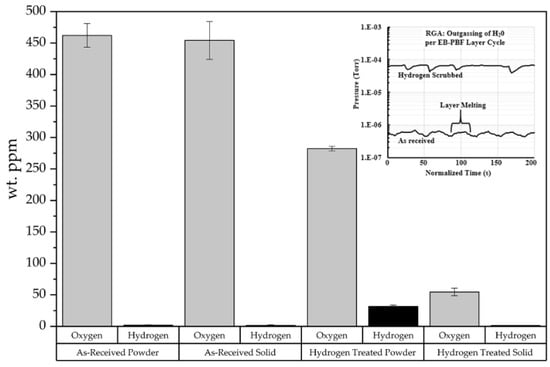 Oxygen and hydrogen content of precursor powders and solid copper cylinders produced with the EB-PBF of untreated and hydrogen-treated MO-Cu powder, and (inset) in-situ residual gas analysis of both EB-PBF runs, showing the layerwise outgassing of H2O.