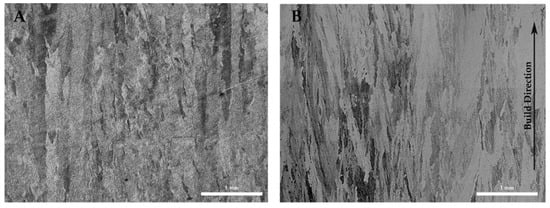 Optical micrographs showing polished and etched microstructures of copper samples fabricated with EB-PBF using hydrogen heat-treated MO-Cu powder (A) and untreated MO-Cu powder (B). The build direction for both samples are indicated by the arrow in B.