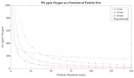 Wt. ppm oxygen as a function of the particle size, assuming a 5 nm cuprous oxide film.