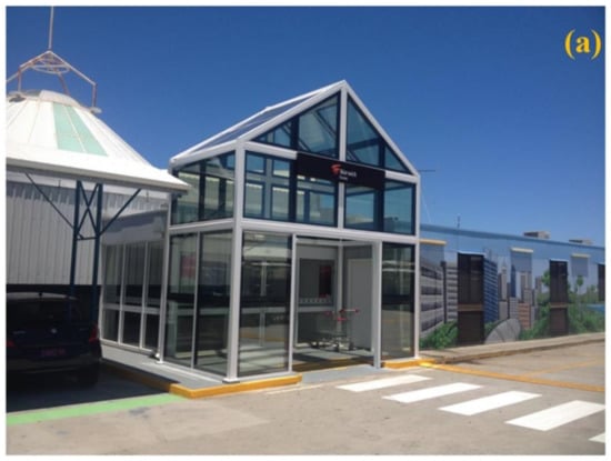 The solar window design type was derived from the previous transparent solar window designs, multiple prototype models of which have been developed by Edith Cowan University (ECU) and Clearvue Technologies over several recent years and were trialed in 2017 at a grid-independent bus stop in Melbourne [22]. Several engineering features related to the glazing system structure, window size, system packaging-related details, and solar modules circuitry implementation have changed since these were reported originally [22], improving the peak-rated electric power output of transparent solar windows towards 30 Wp/m2, measured at standard test conditions (STC) using the manufacturer-sourced large-scale flash-lamp PV testing equipment. The core design and assembly-related features of solar windows remained almost the same, and included the triple-glazed structure, low-iron glass plates, low-emissivity heat-mirror coating, and particles of high Stokes-shift inorganic luminescent materials embedded into a lamination interlayer. More technical details are available from [23,24,25,26], whist the general system design philosophy has been derived from the approaches reported throughout the last several decades in [27,28,29,30], and in references therein. This present study represents, to the best of our knowledge, a world-first report on the field performance characteristics and practical application potential of high-transparency, clear glass-based solar windows built using all-inorganic functional materials, in built environments where the windows are mounted in multiple geometric orientations.