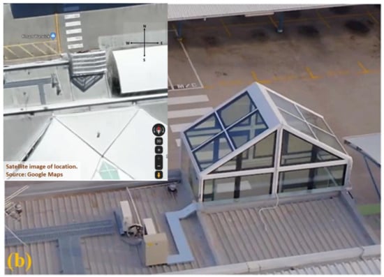Entrance porch (atrium) of Warwick Grove Shopping Centre in Warwick (Perth, WA, Australia) constructed using 18 solar windows supplied by Clearvue Technologies Ltd. (Perth, WA, Australia). (a) front view and (b) top view, with the inset showing satellite image of the same entrance atrium structure prior to solar windows installation. The site orientation-related data are also shown; the roof sides are tilted at ≈ 37° from horizontal plane.