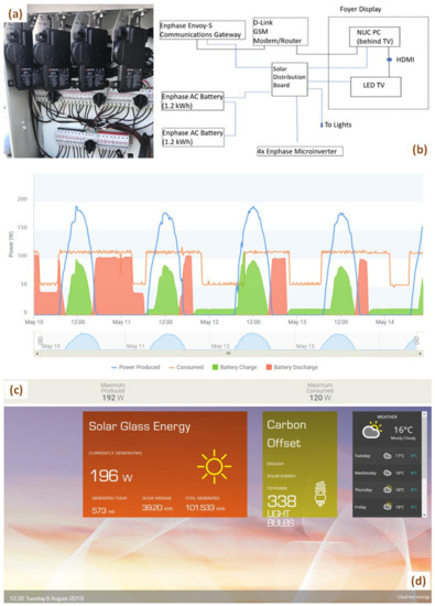 A graphical summary of the microgrid configuration details (a,b), sample data logs for the daily energy generation and use (c), and a photo of TV screen data showing a summary of system state (d), which is also available through live Internet broadcast at http://tcp.iotstream.io/vicinity-warwickgrove/index.php with 15-minute data sampling intervals.