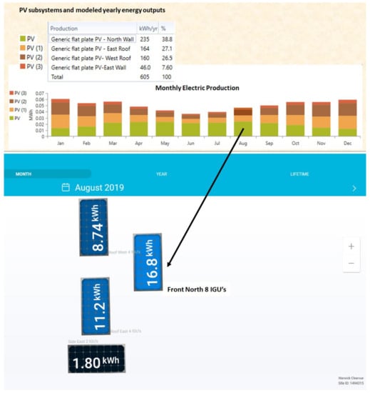 Predictive modelling of the electric energy outputs expected to be generated by the atrium installation and each of its parts annually (and also monthly) has been performed using HOMER Pro microgrid analysis software package (HOMER Energy Inc., Boulder, CO, USA). The unconventional PV generators (solar windows) have been approximated in the software-assisted microgrid model as “generic flat plate PV” outputting 30 W per window at peak irradiation conditions, at the nominal operating cell temperature (NOCT). This power rating per window closely approximates their expected performance at the peak orientation and peak-weather conditions, when the temperature of solar cell surfaces is near 40 °C. The model has also fully accounted for the local monthly and yearly climate-related solar irradiation datasets corresponding to the exact geographic location of installation. The geometric orientation (tilt) and also the azimuth orientation angles of all system parts were fully accounted for in the software model. Figure 3 shows a graphical summary of the energy generation modeling results, obtained for each PV windows subsystem and for the overall atrium installation.