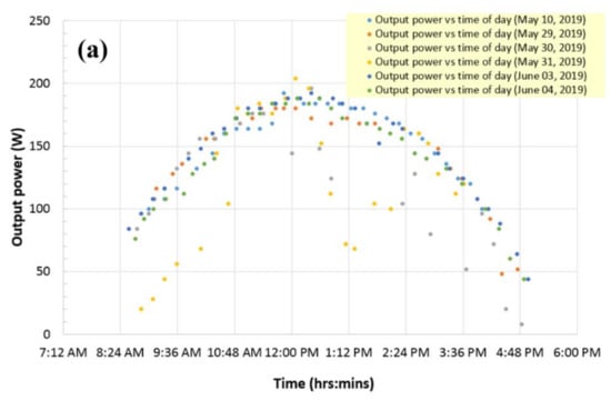 Figure 4 shows the dependencies of the generated electric power and stored energy on the time of day, measured over several sunny days in May and June of 2019. It is interesting to note the high consistency of the power generation on different sunny days, even measured weeks apart. The effects of variable weather conditions such as cloud cover are also seen in the graphs.