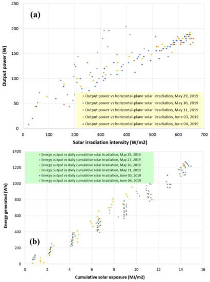 Energy harvesting performance vs solar exposure parameters. (a) Output power vs solar irradiation intensity measured in the horizontal plane by a local weather station; (b) generated electric energy vs daily land-area cumulative solar exposure (measured by the same weather station since midnight of the same day).