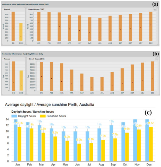 Seasonal yearly climate-related solar irradiation parameter variations for Perth, Australia. (a) Monthly averaged and maximum-recorded direct-beam solar irradiation intensities measured across horizontal plane; (b) monthly averaged and maximum-recorded direct-beam solar illuminance values measured across horizontal plane; (c) monthly distributions of the total daylight hours and the daily sunshine durations. The datasets shown in parts (a) and (b) have been obtained using COMFEN 5 software [46]; the dataset of part (c) has been published online by [31], using the publicly-available Australian Bureau of Meteorology data.