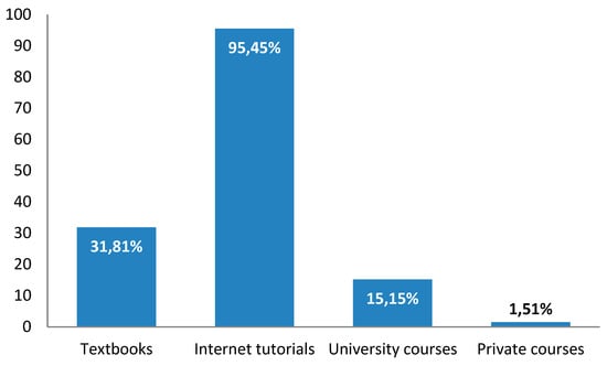 The results shown in Figure 1 show a generational change in the students. As Macdonald and Granroth [] previously pointed out, the “Google Generation” has arrived in university classrooms. Students are currently looking for information on the Internet (e.g., through video tutorials) rather than using a textbook. This is certainly a challenge for universities. Students sometimes prefer Massive Open Online Courses and low-cost courses over traditional classes [].
