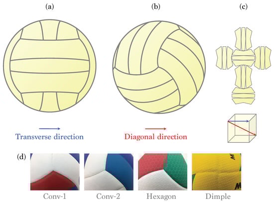 Surface patterns of volleyballs with (a) transverse and (b) diagonal directions on panels. (c) In conventional volleyballs, the existence of two panel directions is a result of conventional assembly with six panels. (d) Surface patterns for conventional balls (Conv-1 and Conv-2) and modified balls with hexagon and dimple patterns.
