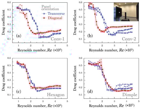Drag crisis of volleyballs. Circles and squares represent transverse and diagonal directions, respectively, with different surface patterns: (a) Conv-1, (b) Conv-2, (c) Hexagon and (d) Dimple. Inset shows the wind tunnel experiment. To check out the experimental uncertainty, three data were included for each case. Discrepancy in drag crisis appears in conventional balls, while similarity in drag crisis in balls with isotropic patterns.