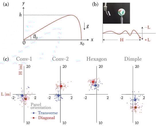 Flight characteristics of volleyballs. (a) An illustration for flight trajectory. (b) Lateral (L) and horizontal (H) flight distances were measured from the landing position experiment using a hitting robot. (c) All data of lateral and horizontal distances are summarized. Each panel with equidistant intervals is depicted at the same range of m (lateral) and from 10 to 20 m (horizontal). Blue and red represents transverse and diagonal directions, respectively. Big circles and squares are the average values with error bars taken from the standard deviations.