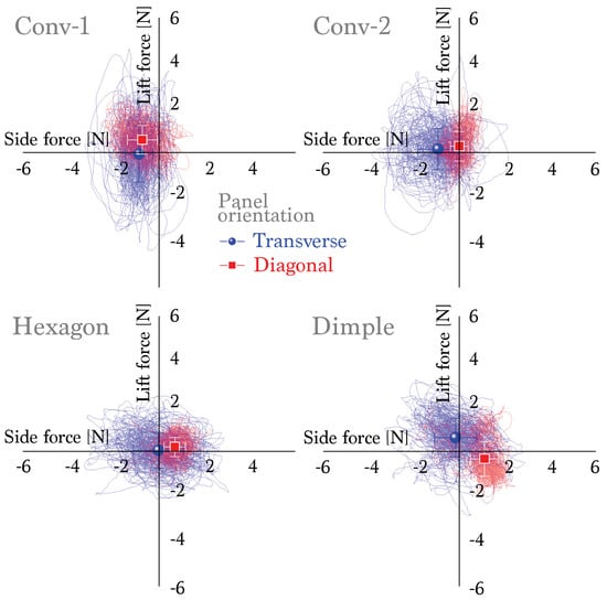 The lift and side forces acting on the ball taken in the wind tunnel experiment (10 s, wind speed 15 m/s) are quite isotropic from the balls with isotropic (Hexagon and Dimple) surface patterns. Blue and red represents transverse and diagonal directions, respectively. Big circles and squares are the average values with error bars taken from the standard deviations.