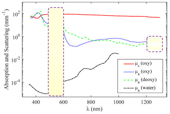 - Matcher, S.J.; Cope, M.; Delpy, D.T. In vivo measurements of the wavelength dependence of tissue-scattering coefficients between 760 and 900 nm measured with time-resolved spectroscopy. Appl. Opt. 1997, 36, 386–396. [Google Scholar]