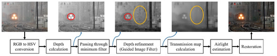 The prevalence of consumer cameras and the urgent need for groundbreaking work in surveillance or autonomous driving systems have demanded the rapid development of image/video processing algorithms. Among them, the task of eliminating unwanted-but-inevitable weather phenomena from an image has drawn increasing attention in recent years. Generally, this image processing problem is known as visibility restoration. A myriad of algorithms have been proposed to recover the visual quality of weather-degraded images to be as similar as possible to the original ones taken under clear weather conditions. Low-light image enhancement [1,2,3,4], rain removal [5,6,7,8], and image dehazing [9,10,11,12,13,14,15,16,17,18,19,20,21,22,23,24,25,26,27] are cases in point. Haze removal ones, of all the algorithms developed for visibility restoration, have positive impacts on both photography and computer vision applications. Not only does haze removal function properly in hazy, foggy, or misty weather, but it also is appropriate for removing the effect of yellow dust or dust storm on the captured image. Owing to rapid industrialization and urbanization yellow dust is a topical issue in Eastern Asian countries [28] and there is growing demand for a highly sophisticated visibility restoration algorithm.