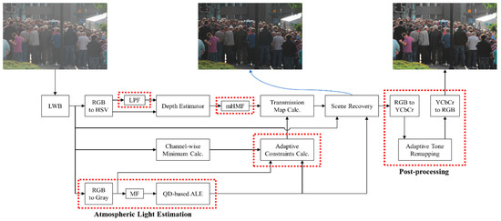 Figure 2 shows the block diagram of the proposed Improved Color Attenuation Prior (ICAP). The abbreviations used in this figure include those for Local White Balance (LWB), Low-Pass Filter (LPF), modified Hybrid Median Filter (mHMF), Minimum Filter (MF), Quad-Decomposition (QD), and Atmospheric Light Estimation (ALE). The five red dotted rectangles represent the functional blocks that distinguish the proposed algorithm from the original CAP. LPF is applied to the image’s saturation channel to remove the background noise. Atmospheric light estimation based upon a quad-decomposition algorithm is effective in lowering the computational complexity and, also, leads to the use of a simple mHMF in place of a very large guided image filter to refine the depth map. An Adaptive Constraints Calculation block strictly constrains the transmission map, preventing the situation where image pixels become negative after dehazing and turn into black pixels. Post-processing blocks include Adaptive Tone Remapping and color converters. They are used to expand the dynamic range of the image after removing haze. We will delve deeply into these differences in following sub-sections.