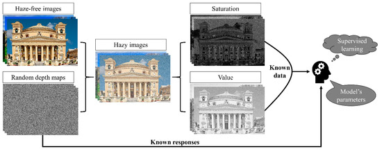 The training data consisting of hazy images and their corresponding ground truth depth maps are required to correctly learn the coefficients , , and in Equation (14). Unfortunately, the acquisition of an accurate depth map is extremely difficult since there is no reliable means to obtain the scene depth. Therefore, Zhu et al. [20] used a synthetic database to train their proposed linear model. The training data preparation phase can be described in four steps: (i) collecting the haze-free images from image-sharing services like Google Images or Flickr; (ii) generating random depth maps with the standard uniform distribution on the open interval (0, 1); (iii) generating a random global atmospheric light with its value between 0.85 and 1.0; (iv) substituting these variables into the atmospheric scattering model to calculate the synthetic hazy images. Then, the saturation and value channels of these hazy images are used as input data, while the random depth maps are employed as known responses in the supervised learning strategy. Three coefficients in Equation (14) were learned by maximizing the natural logarithm of the likelihood using the stochastic gradient ascent algorithm. Zhu et al. [20] also provided a detailed flowchart showing mathematical expressions for both calculating the partial gradients and updating the coefficients. Figure 3 depicts this data preparation procedure.