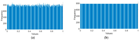 Histograms of 200,000 random numbers: (a) drawn from the standard uniform distribution and (b) drawn from the enhanced equidistribution.