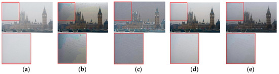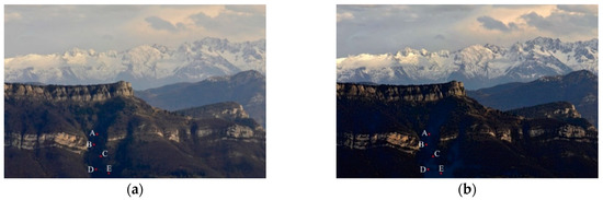 To determine the cause of color distortion, five pixels in the dark region of the input hazy and dehazed images have been taken into consideration, as illustrated in Figure 11. When the scene radiance of the haze-free image is recovered using Equation (2), the pixel values within the dark image region marked A, B, C, D, and E will be decreased slightly or sometimes unchanged. Table 1 shows the blue channel has larger values, in comparison to the red and green channels. Following dehazing, the small decrease has a negligible impact on the large blue channel, but significant impact on the small red and green channels. Therefore, the dark regions in the dehazed image look blue, as shown in Figure 11b.
