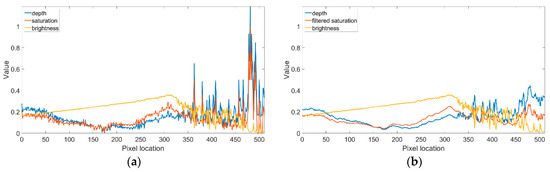 where is the scattering coefficient of the atmosphere, and is the scene depth. The large results in a small in the distant regions. Accordingly, a decrease in the image’s saturation caused by the multiplicative direct attenuation term and an increase in the image’s brightness caused by the additive airlight term lead to a big difference between the image’s saturation and brightness. To contrast, the small in the close regions results in a large , therein lies the cause for the small difference between the image’s saturation and brightness. Hence, Zhu et al. [20] proposed a linear model describing the correlation between the scene depth and the difference between the image’s saturation and brightness: