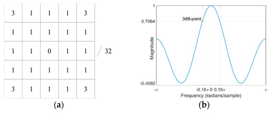 Background noise removal low-pass filter’s coefficients and one-dimensional frequency response: (a) coefficients and (b) one-dimensional frequency response.