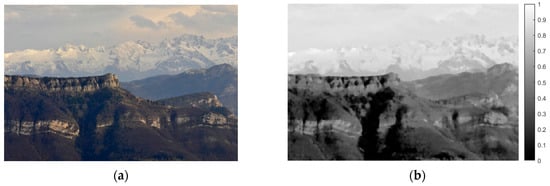 since the assumption about the dark channel prior () leads to . The application-based positive constant is added to Equation (6) to optionally keep a small amount of haze for human depth perception [13]. Transmission map estimation requires that is known in advance. The authors first select the top 0.1 percent brightest pixels in the dark channel to estimate . Amongst these pixels, the one with highest intensity in the input image is chosen as the atmospheric light .