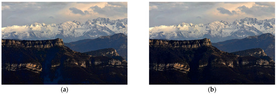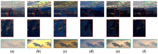 Moreover, Equation (28) gives the formula of TMQI, where and now denote two color images. is the statistical naturalness measure, is the overall structural fidelity score, is used to adjust the relative importance of these two components, and and determine their sensitivities. Even though and are two color images, TMQI only evaluates their grayscale channel to assess the structural information preserving characteristics. TMQI takes on values within the range [0, 1], in which the higher, the better: