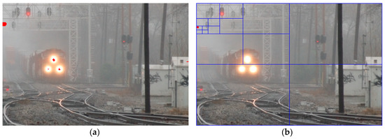 This algorithm operates on the image’s luminance channel which, to prevent the unwanted influence of white objects, must be processed by a minimum filter in advance. Then, it iteratively divides the image’s luminance into quarters and selects a quarter with the largest average luminance, until the quarter’s size is less than a predetermined value. Using the finally selected quarter, a pixel with minimum Euclidean distance to (1, 1, 1) coordinate in the RGB space is chosen as the atmospheric light. Figure 14a shows an image in the IVC dataset where CAP fails to estimate the atmospheric light correctly. The red pixels are those corresponding to 0.1 % of the farthest pixels in the depth map, and the chosen one is the pixel in the train’s front light. Furthermore, CAP needs to search through the entire spatial area of an image to find these pixels. To contrast, since the train’s front light cannot dominate the average brightness in the image quarters, quad-decomposition does not take it into consideration. Simultaneously, the search area also is reduced iteratively by a factor of four for accurate estimation. The red dot in Figure 14b refers to a pixel being chosen as the atmospheric light, but it is enlarged for visual convenience.