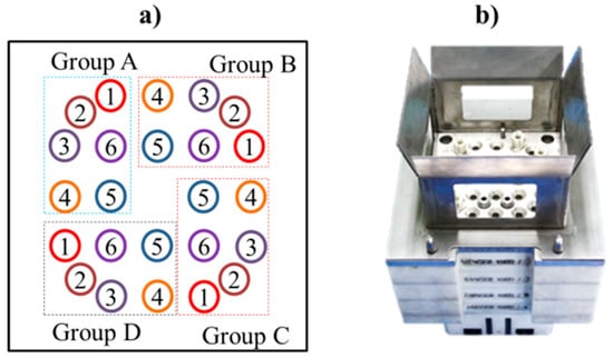 Figure 2a shows the position of the control rods of a 17×17 type RCCA used in the laboratory test. The 17×17 type RCCA has 24 control rods assembled in a bundle. Each control rod has a diameter of 9.68 mm, cladding tube (STS304) having a thickness (W.T) of 0.47 mm, and an absorber inside made of Ag (80%)-In (15%)-Cd (5%). An inspection stage for the RCCA is shown in Figure 2b, which has 24 holes aligned with the center of the control rods. The holes were positioned in four groups A, B, C, and D, and the group was rotated 90° from each other, as described in Figure 2c. An EHaS probe was assembled at each hole for inspection of a single control rod. Thus, all the control rods in the RCCA could be inspected in just one scan.